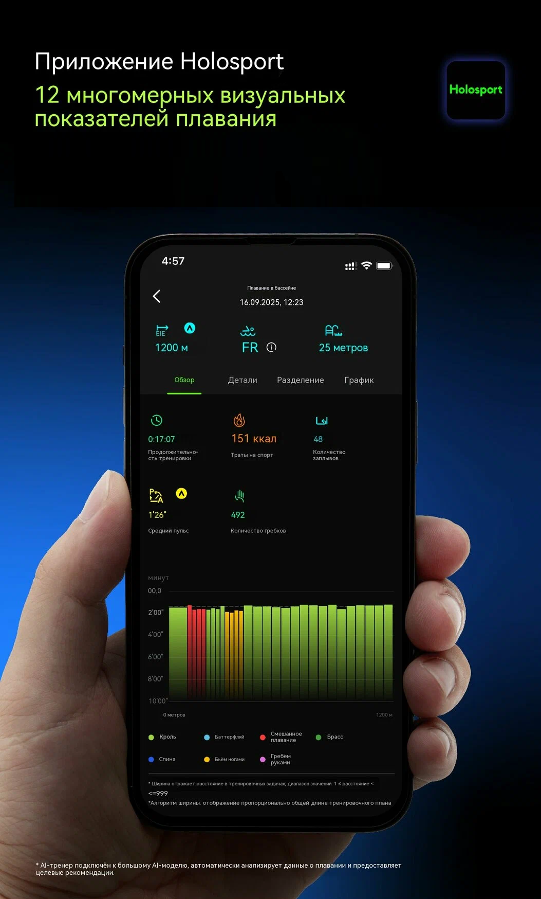 - Автоматическое распознавание стилей: брас, кроль, баттерфляй и плавания на спине