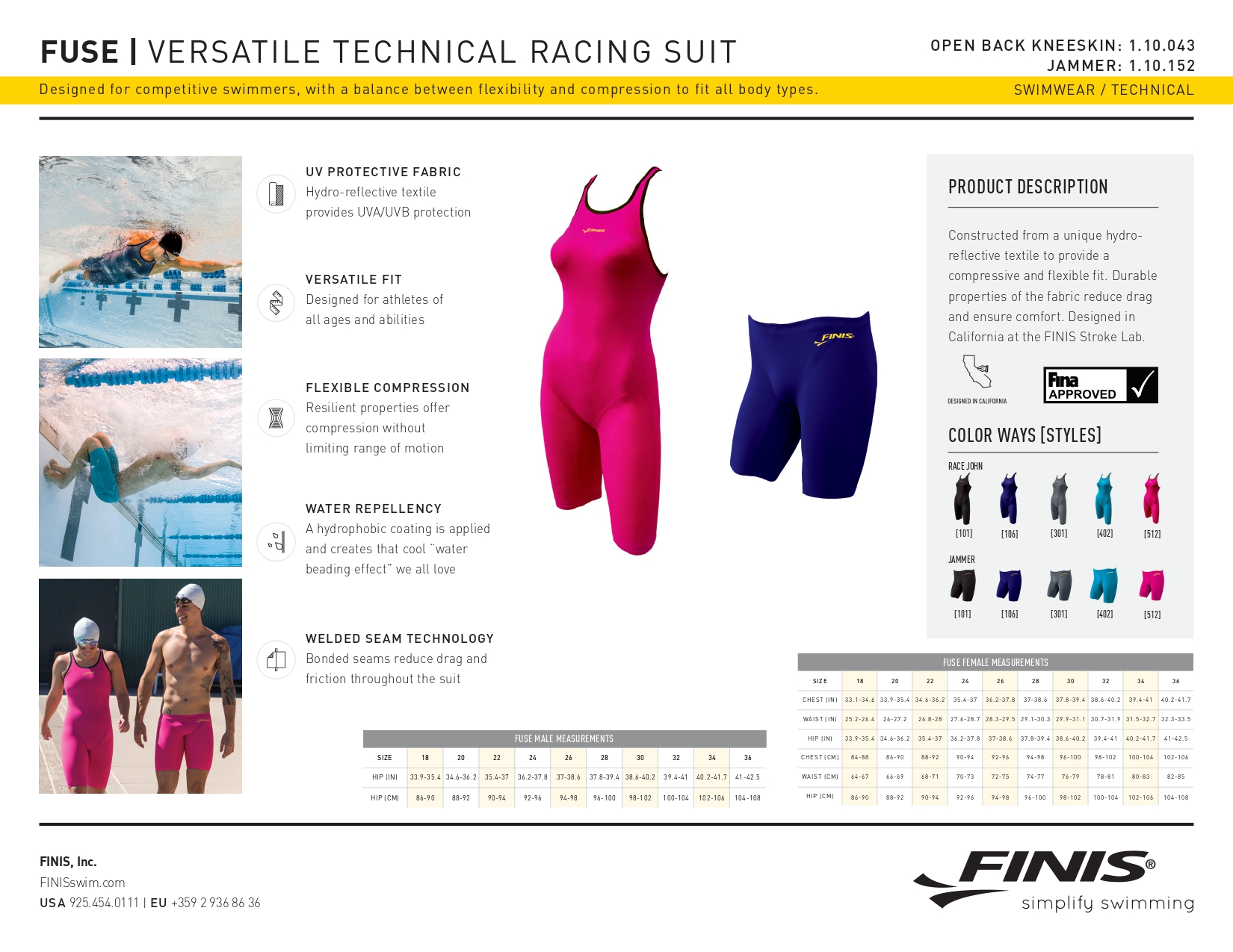Новейшие технологии, разработанные инженерами Finis в центральной лаборатории в Калифорнии, позволили создать одни из самых доступных стартовых гидрошорт на рынке. Модель Fuse выполнена из уникального гидроотражающего материала: кроме полной устойчивости к любым типам ультрафиолетового излучения, он обладает оптимальными характеристиками эластичности, за счет чего обеспечивается идеальная посадка по фигуре и лучший гидродинамический профиль, снижающий сопротивление при продвижении в воде. Одновременно с этим гидрошорты позволяют иметь максимальную амплитуду и свободу движений, что во многом обеспечивается не только характеристиками ткани, но и слитной плоской конструкцией швов.