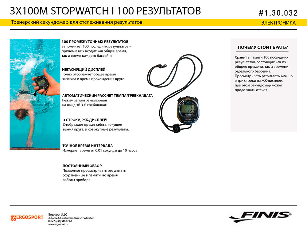 Представляем привычный всем спортсменам аксессуар – секундомер 3X-100M Stopwatch. Компания Finis, которая производит товары, разработанный пловцами и для пловцов, рекомендует эту модель как для самих спортсменов, так и для их тренеров.