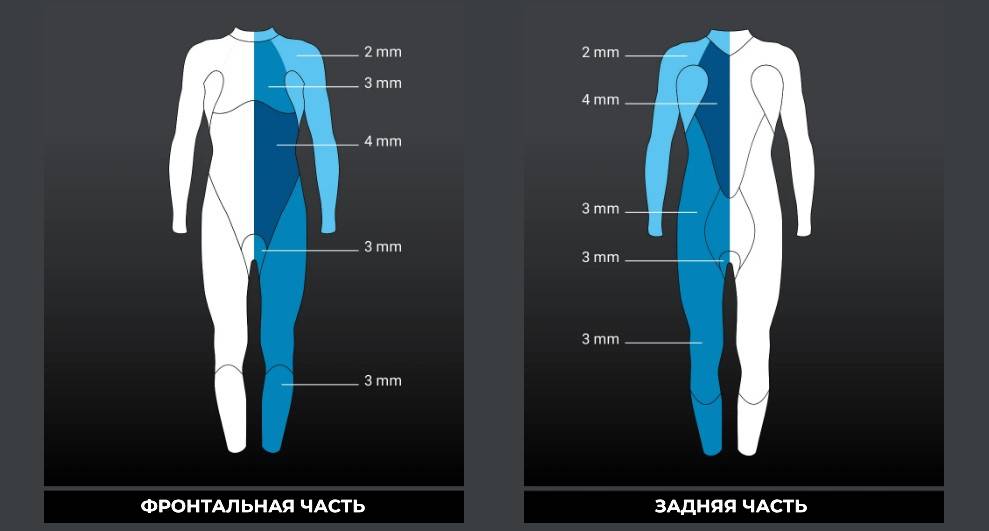 ТОЛЩИНА НЕОПРЕНА: руки - 2 мм; грудь, ноги - 3 мм; кор, средняя часть спины - 4 мм