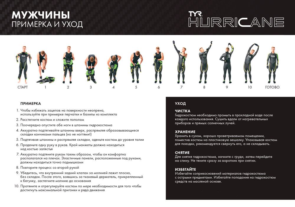 В области лодыжек манжеты позволяют быстро снимать и надевать экипировку при транзите, а антимикробная подкладка предотвращает износ, выцветание и появление неприятного запаха. Все модели гидрокостюмов линейки TYR Hurricane сертифицированы WTC (World Triathlon Corporation, организаторы мирового триатлона Ironman) и USAT.