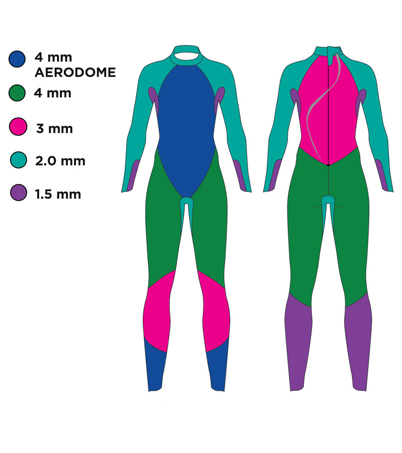 - Панели Aerodome, имеющие толщину 4 мм и также выполненные из неопрена Yamamoto 39, стратегически располагаются в передней части торса и в области голеней для достижений превосходной плавучести и максимально сбалансированного положения тела в воде.