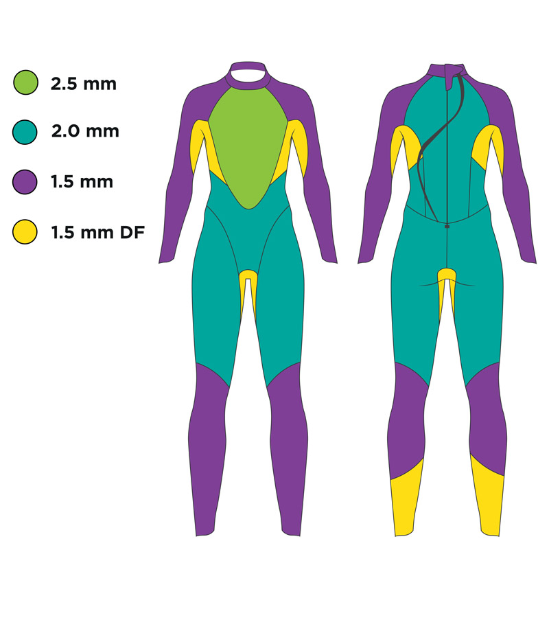 - Неопрен Yamamoto 38, обладающий вариативной толщиной (зоны 3 видов, от 1,5 до 2,5 мм), для достижения баланса гибкости, свободы движений и плавучести, в сумме обеспечивающих превосходную гидродинамику. В области подмышек и под коленями использован специальный двухслойный неопрен, повышающий долговечность и противодействующий изломам в местах сгиба.