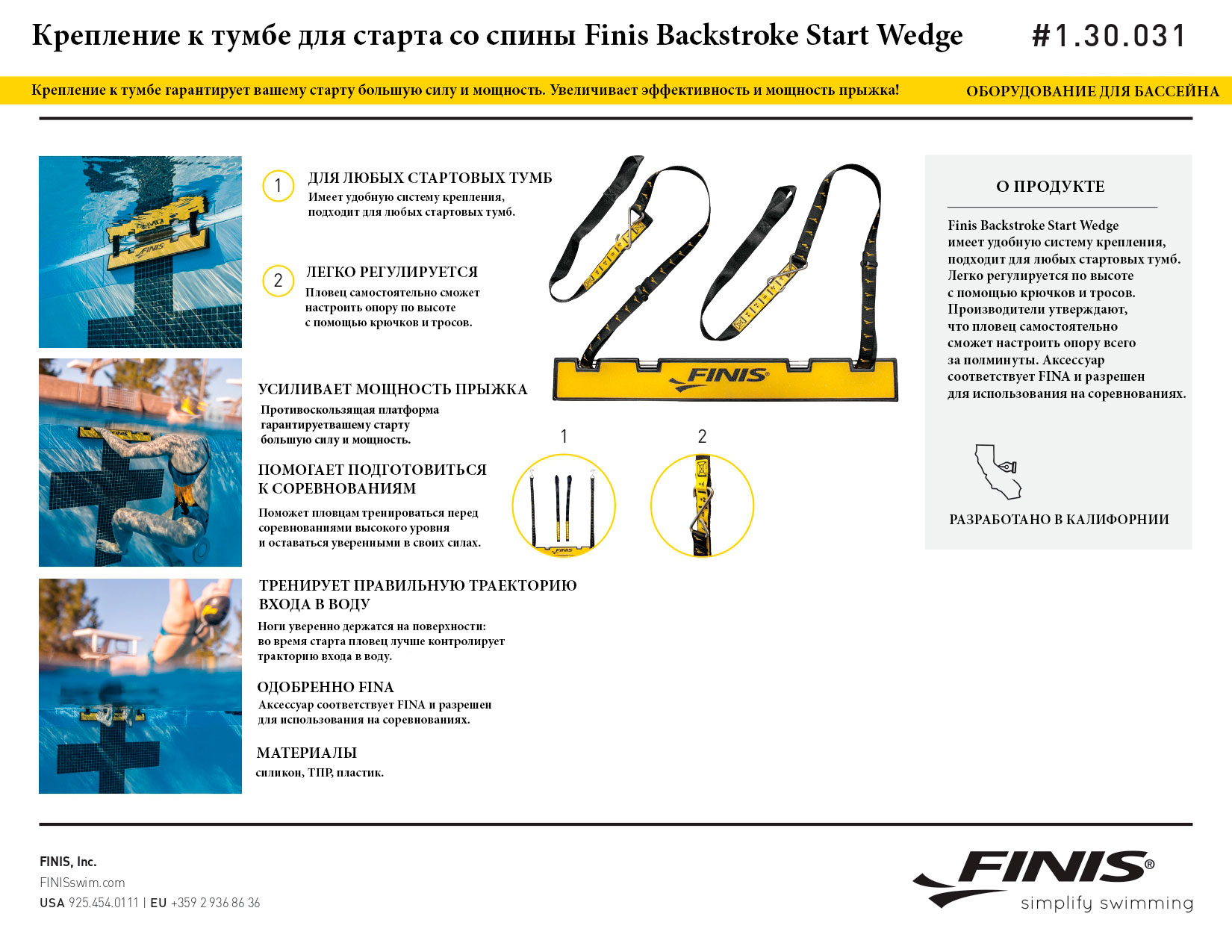 Finis Backstroke Start Wedge имеет удобную систему крепления, подходит для большинства стартовых тумб. Легко регулируется по высоте с помощью крючков и тросов. Производители утверждают, что пловец самостоятельно сможет настроить опору всего за полминуты. Аксессуар соответствует FINA и разрешен для использования на соревнованиях.
